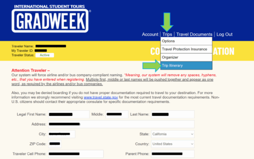 We strive to make trip information easily accessible to the travelers and their parents/guardians. This is why we use multiple methods of communication to give you access to the documents you will need. Approximately 2-3 weeks before departure, we will mail your Departure Packet. This will include your e-ticket/itinerary (also available in your online account late April to early May, the year of travel) as well as other important documents containing travel tips and reminders. Then, approximately 1 week before travel, we will email and text both contacts on the account a digital copy of your Departure Packet with instructions on how to print and use your e-ticket/itinerary in case you lose or misplace it. This is why it is so important to have up-to-date traveler and parent/guardian contact information on your account. Ensure your mailing address is correct at least 2 months before your departure date to avoid delivery issues. Other trip documents will be accessible to you at www.gradweek.com under ‘About Us’ > ‘Resources’.